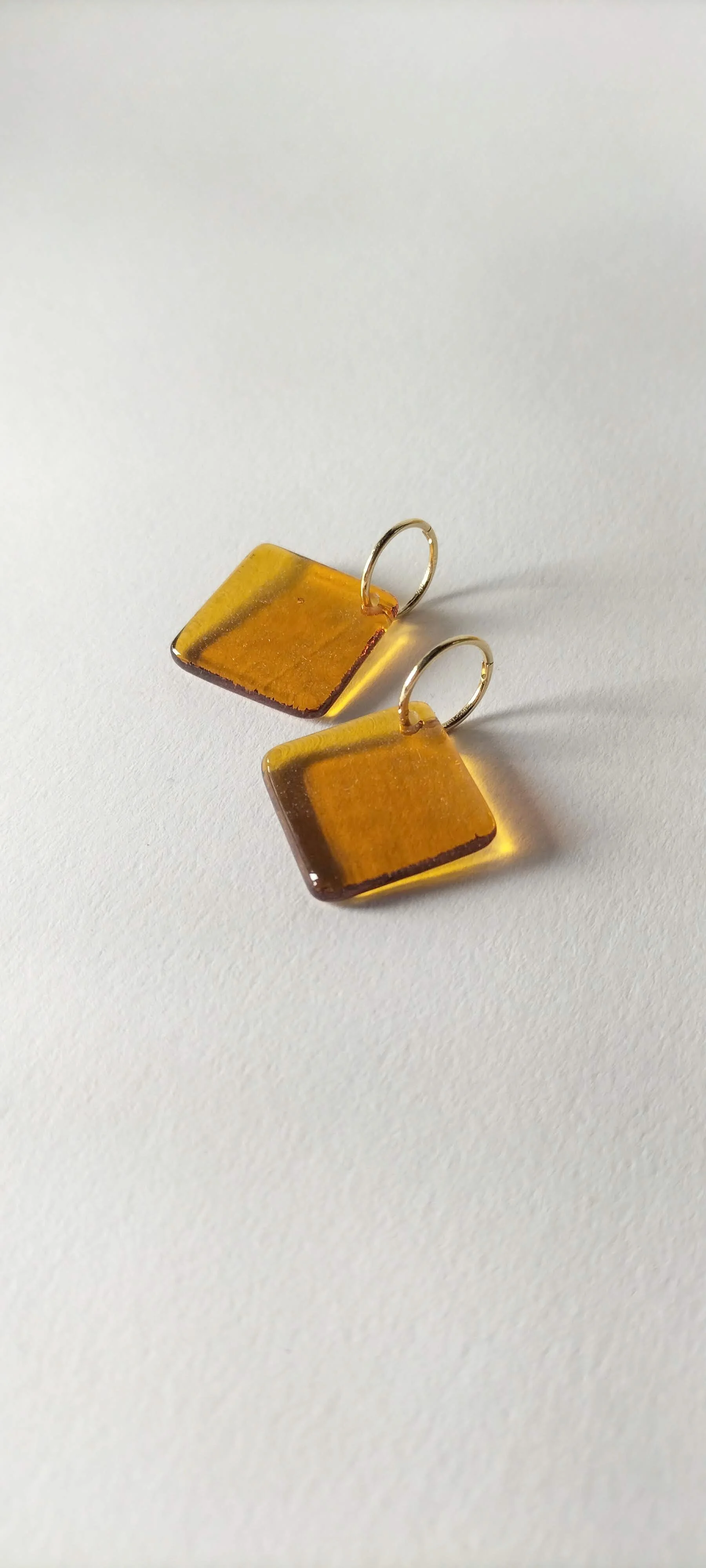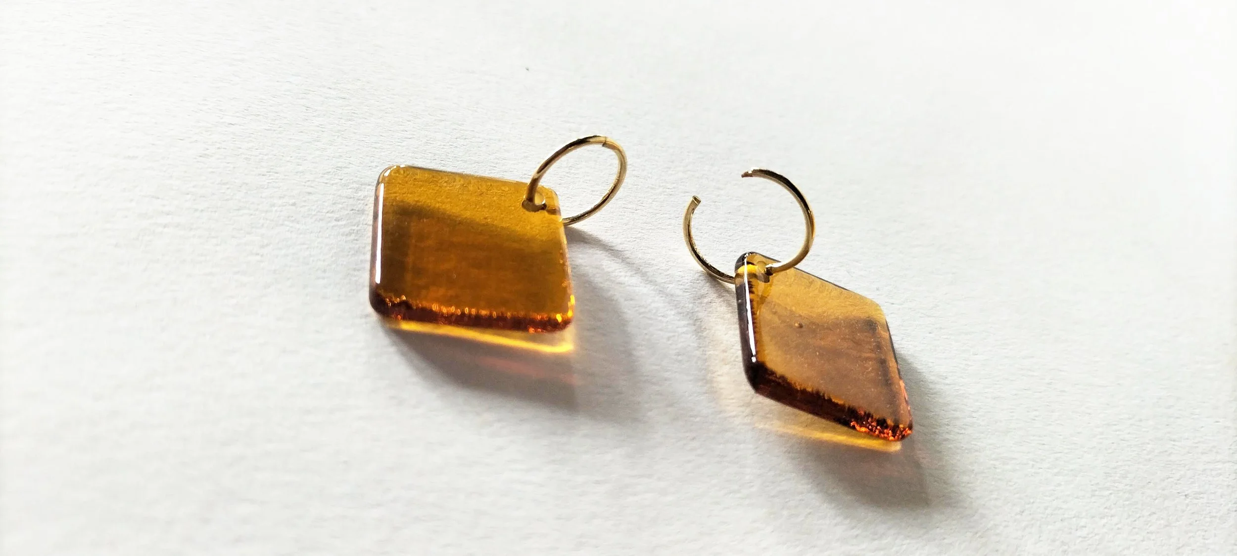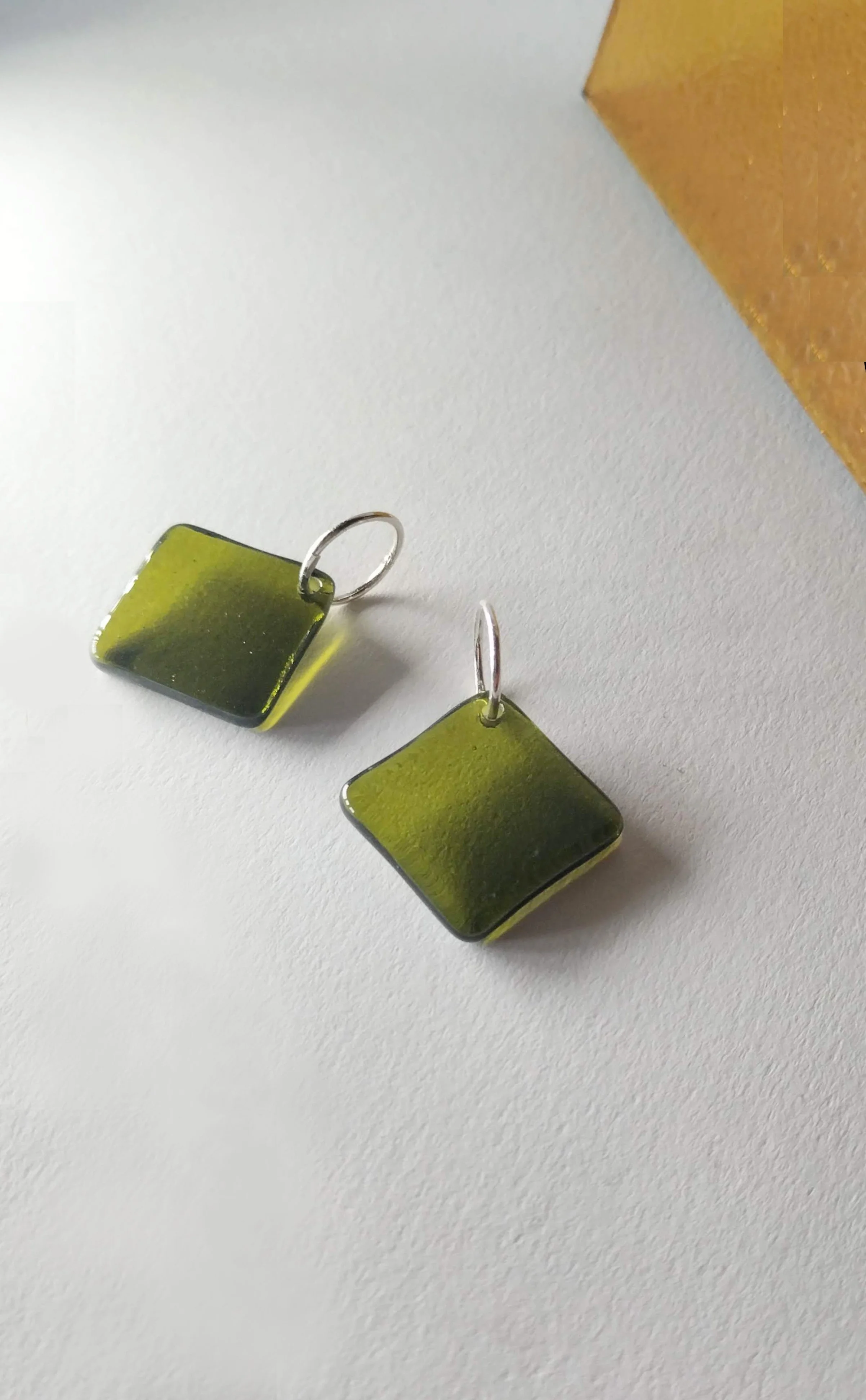Diamond shaped glass earrings on simple sleeper rings are easy to wear at the office, beach or dance floor.